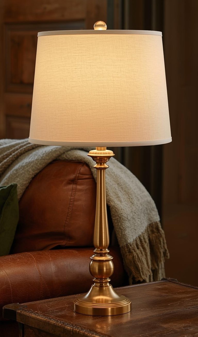 Instead of harsh overhead lights, classic interiors rely on table lamps with warm brass bases and soft linen shades. This creates a gentle glow that instantly makes the room feel calmer.